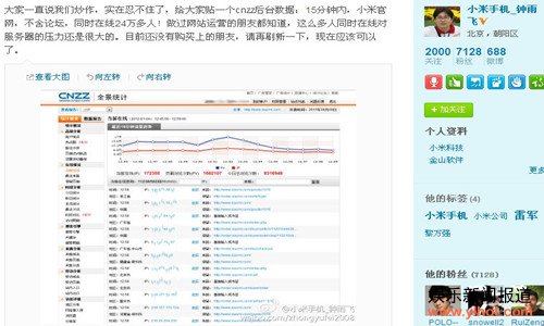 小米手机_钟雨飞在微博称:“大家一直说我们炒作,实在忍不住了,给大家贴一个CNZZ后台数据:15分钟内,小米官网,不含论坛,同时在线24万多人!做过网站运营的朋友都知道,这么多人同时在线对服务器的压力还是很大的。目前还没有购买上的朋友,请再刷新一下,现在应该可以了。”